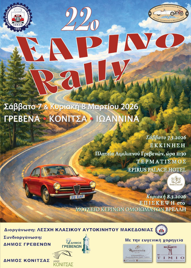 Στα Γρεβενά θα «χτυπήσει» δυνατά η καρδιά της κλασικής αυτοκίνησης το Σάββατο 7 Μαρτίου, καθώς από την Κεντρική Πλατεία της πόλης θα δοθεί η εκκίνηση (11:30 πμ.) για το 22ο Εαρινό Ράλι που διοργανώνει η Λέσχη Κλασικού Αυτοκινήτου Μακεδονίας.