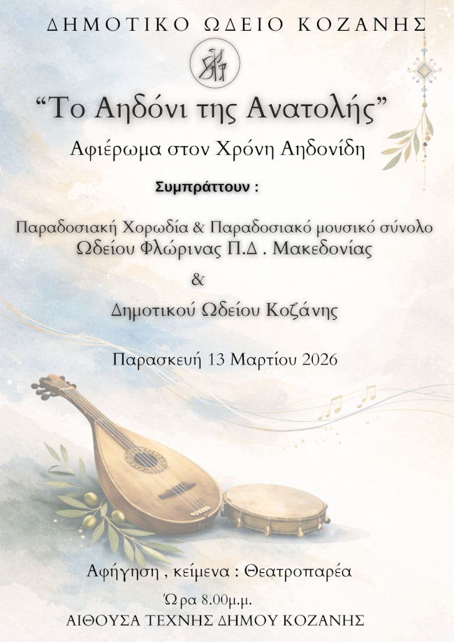 Το Δημοτικό Ωδείο Κοζάνης παρουσιάζει την Παρασκευή 13 Μαρτίου 2026, στις 8:00 μ.μ., στην Αίθουσα Τέχνης Δήμου Κοζάνης τη μουσική εκδήλωση «Το Αηδόνι της Ανατολής», ένα αφιέρωμα στον σπουδαίο ερμηνευτή της ελληνικής παραδοσιακής μουσικής Χρόνης Αηδονίδης.