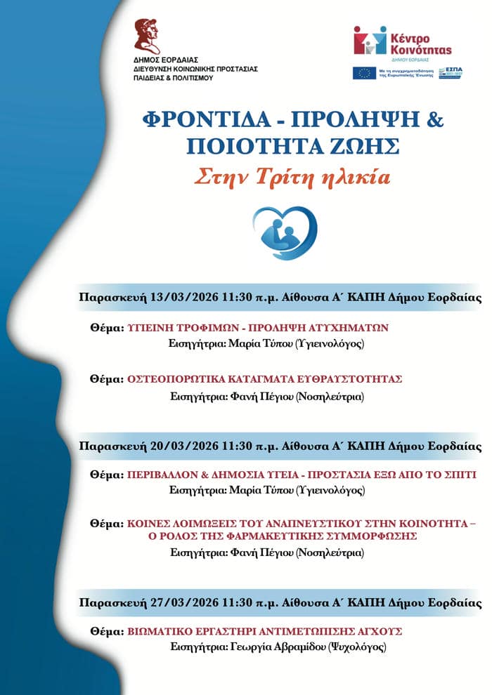 Η δράση πραγματοποιείται από τη Δ/νση Κοινωνικής Προστασίας, Παιδείας και Πολιτισμού και το Κέντρο Κοινότητας του Δήμου Εορδαίας, στο χώρο του Α΄ ΚΑΠΗ, με έναρξη την Παρασκευή 13/03/2026 και ώρα 11:30 π.μ.