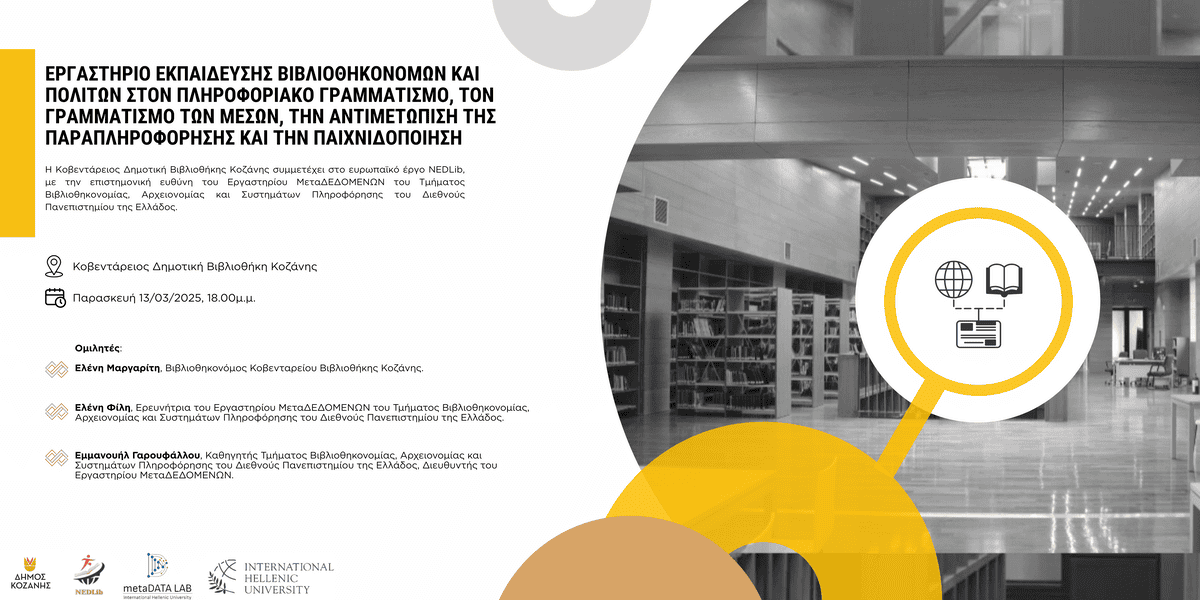 Η Κοβεντάρειος Δημοτική Βιβλιοθήκης Κοζάνης συμμετέχει στο ευρωπαϊκό έργο NEDLib, με την επιστημονική ευθύνη του Εργαστηρίου ΜεταΔΕΔΟΜΕΝΩΝ του Τμήματος Βιβλιοθηκονομίας, Αρχειονομίας και Συστημάτων Πληροφόρησης του Διεθνούς Πανεπιστημίου της Ελλάδος. Το εργαστήριο εκπαίδευσης πραγματοποιείται με τη συμβολή της Διεύθυνσης Α/Βάθμιας και Β/Βάθμιας Εκπαίδευσης Ν. Κοζάνης.