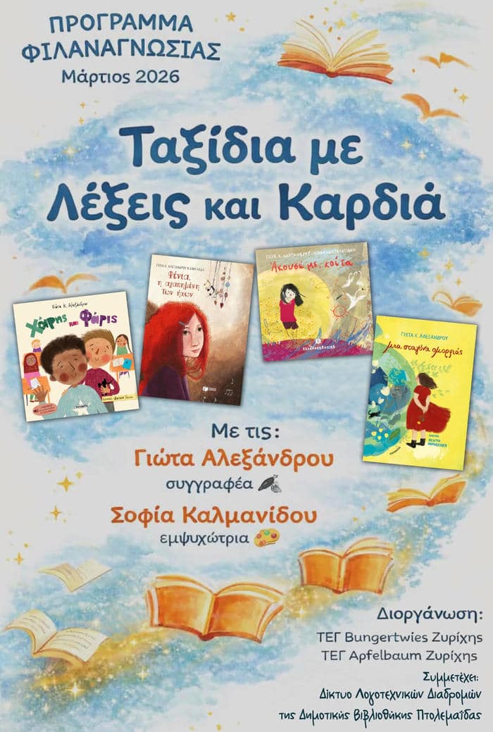 Τα Τμήματα Ελληνικής Γλώσσας Bungertwies και Apfelbaum της Ζυρίχης πρόκειται να υλοποιήσουν το πρόγραμμα φιλαναγνωσίας «Ταξίδια με Λέξεις και Καρδιά», μια βιωματική σειρά δράσεων που συνδυάζει ανάγνωση, παιχνίδι ρόλων, δημιουργική έκφραση και καλλιέργεια συναισθημάτων για τα παιδιά της ελληνικής ομογένειας.