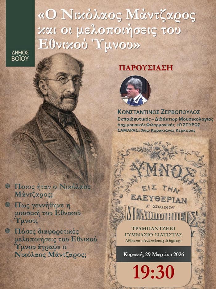 Ο Δήμος Βοΐου, στο πλαίσιο των επετειακών εκδηλώσεων για τον εορτασμό της Εθνικής Επετείου της 25ης Μαρτίου 1821, σας προσκαλεί στην εκδήλωση με τίτλο: «Ο Νικόλαος Μάντζαρος και οι μελοποιήσεις του Εθνικού Ύμνου».