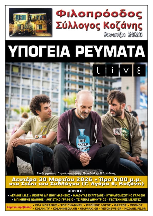 Ο Φιλοπρόοδος Σύλλογος Κοζάνης συνεχίζει τις μουσικές του περιπλανήσεις, στη νέα χρονιά και σας προσκαλεί στο ατμοσφαιρικό και φιλόξενο Αρχοντικό μας, σε μια ακόμη ξεχωριστή συναυλία με τα «Υπόγεια Ρεύματα», την θρυλική μπάντα της αδιάκοπης και πλούσιας διαδρομής.