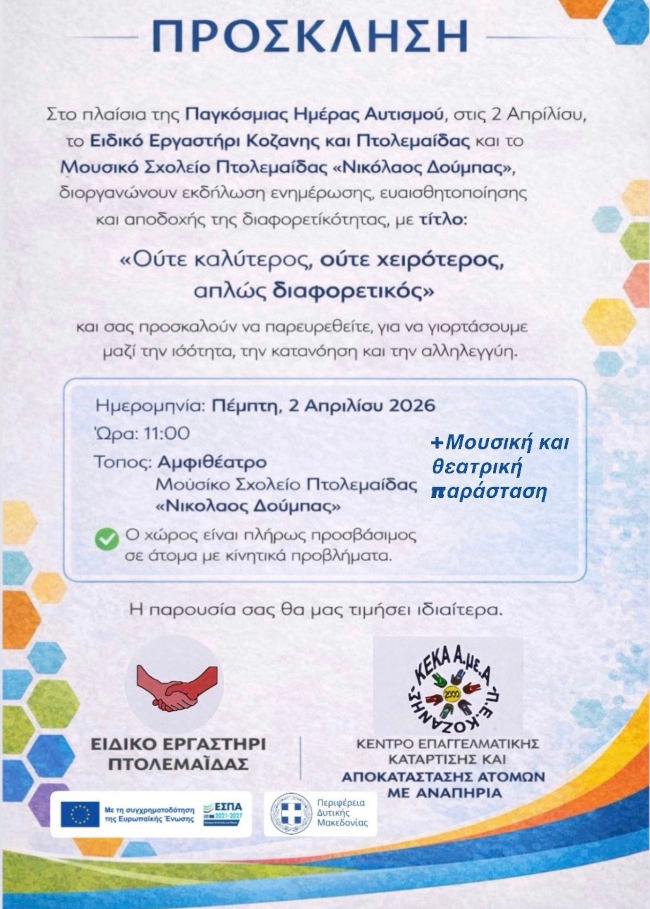 Με αφορμή την Παγκόσμια Ημέρα Αυτισμού, η Πτολεμαΐδα στέλνει ένα ηχηρό μήνυμα ισότητας και συμπερίληψης. Το Ειδικό Εργαστήρι Κοζάνης και Πτολεμαΐδας, σε συνεργασία με το Μουσικό Σχολείο Πτολεμαΐδας «Νικόλαος Δούμπας», διοργανώνουν μια ξεχωριστή εκδήλωση ευαισθητοποίησης που υπόσχεται να αγγίξει τις καρδιές των πολιτών.