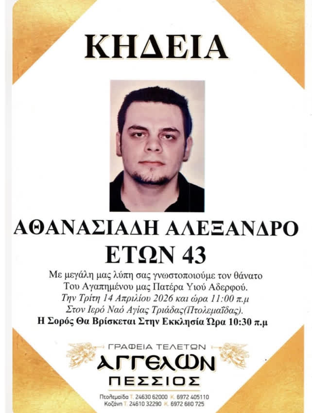 Πτολεμαΐδα 13/04/2026 Πτολεμαΐδα: «Έφυγε» από τη ζωή ο Αλέξανδρος Αθανασιάδης σε ηλικία 43 ετών 0 «Έφυγε» από τη ζωή ο Αλέξανδρος Αθανασιάδης σε ηλικία 43 ετών. Η νεκρώσιμος ακολουθία θα τελεστεί στον Ιερό Ναό Αγίας Τριάδας Πτολεμαΐδας την Τρίτη 14 Απριλίου 2026 στις 11:00 π.μ.