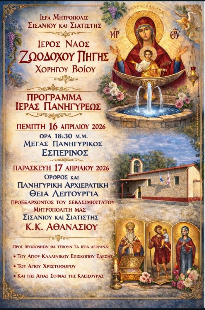 Με λαμπρότητα και θρησκευτική κατάνυξη θα πραγματοποιηθούν οι εκδηλώσεις για την πανήγυρη του Ιερού Ναού Ζωοδόχου Πηγής στον Χορηγό Βοΐου, όπως ανακοίνωσε η Ιερά Μητρόπολις Σισανίου και Σιατίστης.