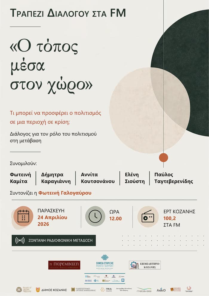 Τραπέζι διαλόγου στα FM θα πραγματοποιηθεί την Παρασκευή 24 Απριλίου 2026, στις 12:00, σε ζωντανή ραδιοφωνική μετάδοση από την ΕΡΤ Κοζάνης, στους 100,2 FM, με θέμα «Ο τόπος μέσα στον χώρο – Τι μπορεί να προσφέρει ο πολιτισμός σε μια περιοχή σε κρίση;» με επίκεντρο τον ρόλο του πολιτισμού σε μια κοινωνία που βρίσκεται σε κρίση και μετάβαση.