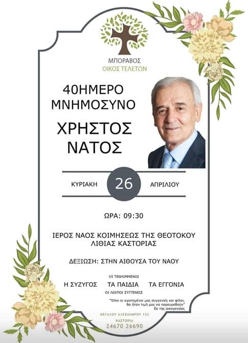 Επιμνημόσυνη δέηση για την συμπλήρωση των 40 ημερών θα τελεστεί στη μνήμη του πρώην Γενικού Διευθυντή της Περιφέρειας Δυτικής Μακεδονίας Χρήστου Νάτου στη Λιθιά Καστοριάς. H επιμνημόσυνη δέηση θα πραγματοποιηθεί την Κυριακή 26 Απριλίου 2026 και ώρα 09:30 στον Ιερό Ναός Κοιμήσεως της Θεοτόκου Λιθιάς Καστοριάς.