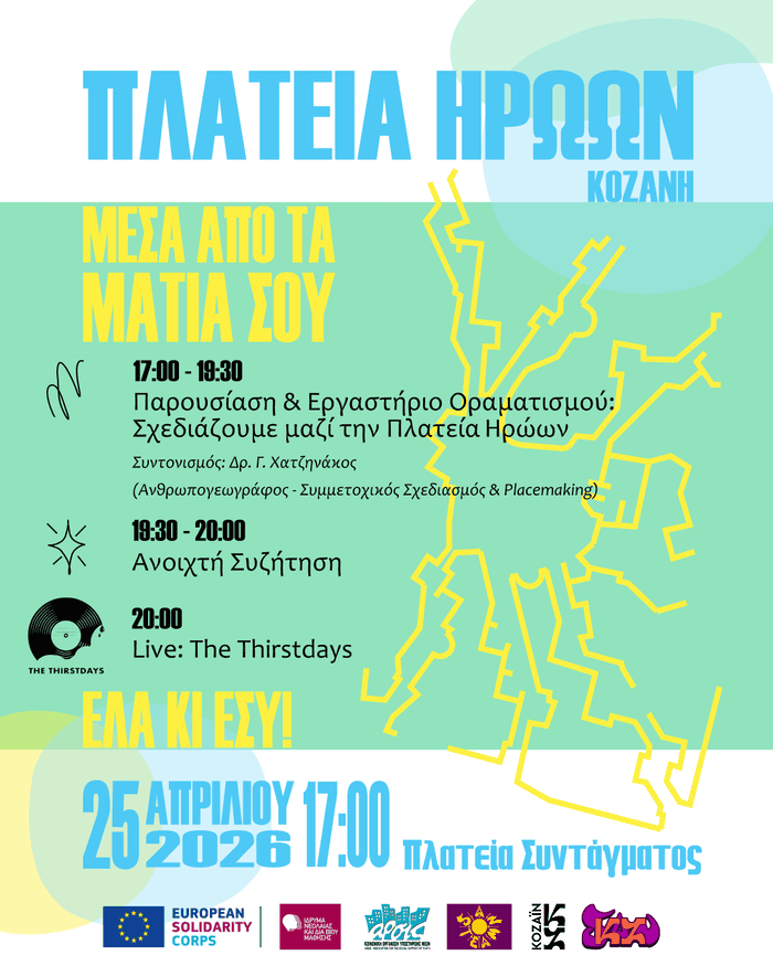 Η Πλατεία Ηρώων (ή αλλιώς Πλατεία Συντάγματος), είναι ένας χώρος που χρησιμοποιείται καθημερινά από τους κατοίκους της περιοχής — για μια γρήγορη διέλευση. Ωστόσο, παραμένει σε μεγάλο βαθμό ένας χώρος που δεν αξιοποιεί πλήρως τις δυνατότητές του ως σημείο συνάντησης και ζωής για τη γειτονιά. Το εργαστήριο οραματισμού αποτελεί μέρος της πρωτοβουλίας της SAN Team και της επιστημονικής φοιτητικής ομάδας ΚΟΖΑΪΝ για την αναζωογόνηση της πλατείας, με στόχο να γίνει πιο ζωντανή, πιο φιλική και πιο ανοιχτή για όλους και όλες.